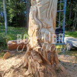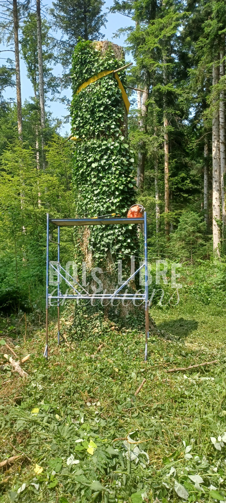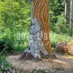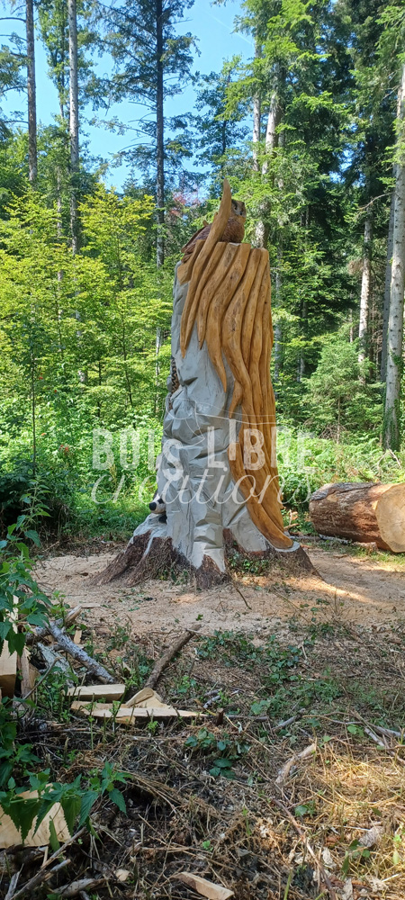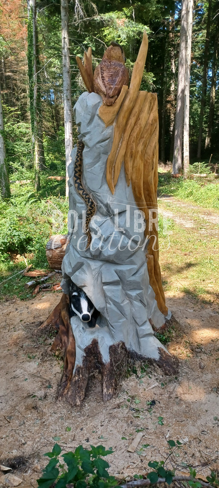 Dans la Forêt de Bofflens, un sapin Président abattu pour des raisons sanitaires a trouvé une seconde vie. Ce bois, fragilisé par le stress hydrique, est devenu la matière d’un Bestiaire monumental, une sculpture à la tronçonneuse célébrant la faune locale. Composé d’un hibou grand-duc, d’une vipère, d’une chauve-souris, d’un renard et d’un blaireau, le bestiaire évoque la diversité des animaux qui peuplent les sous-bois et les plaines environnantes.