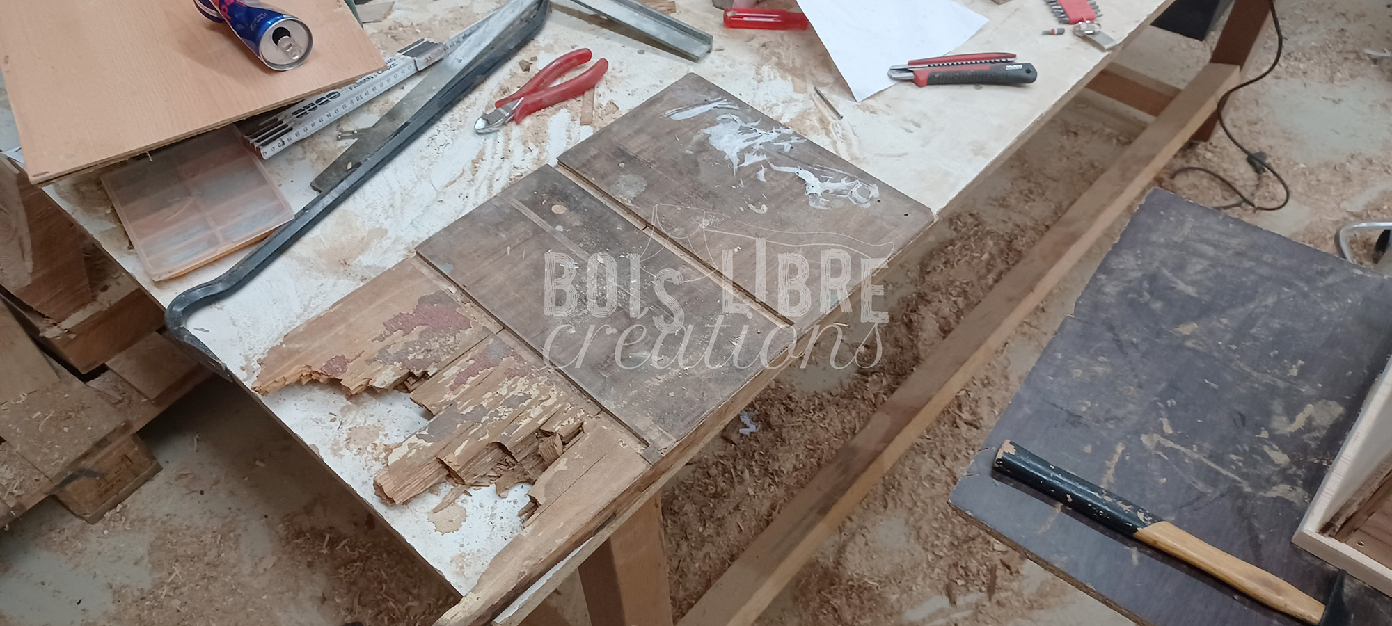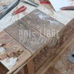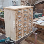 Les poignées ont été démontées, décapées puis polies pour retrouver leur éclat. Le socle et le fond abîmés ont été retirés, remplacés par des pièces recréées sur mesure. Le ponçage complet du caisson et des tiroirs a permis d’éliminer les anciennes couches de vernis et d’unifier la surface. L’ensemble du meuble a ensuite été protégé à la lasure Arbesol incolore, afin de préserver la teinte naturelle du bois et d’assurer sa durabilité.