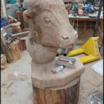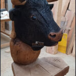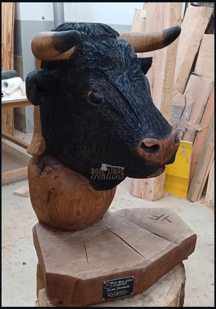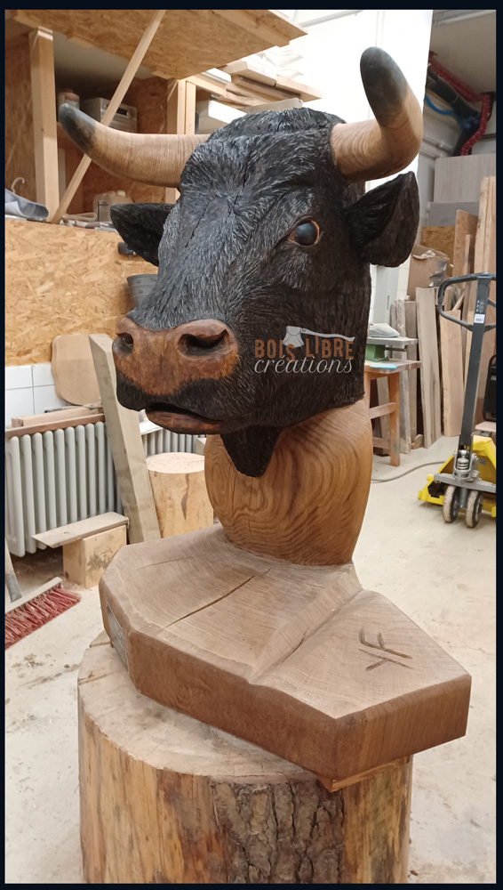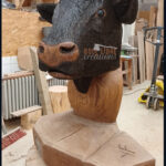 La Sculpture « Buste de Vache d’Hérens » est une pièce unique, entièrement façonnée à la tronçonneuse, puis travaillée avec divers outils de précision pour les finitions. Je l’ai réalisée à partir d’un chêne malade de la région lausannoise, un arbre majestueux d’environ 200 cm de diamètre, que j’ai choisi pour la noblesse de sa matière et la force symbolique qu’il porte. Le bois utilisé est du chêne hors cœur, une zone plus stable et durable, idéale pour la sculpture d’extérieur. L’œuvre mesure environ 60 cm de longueur, 70 cm de largeur et 105 cm de hauteur, pour un poids total de 100 kg.